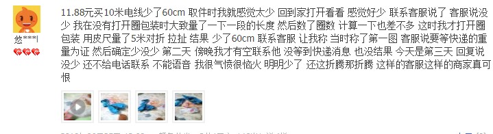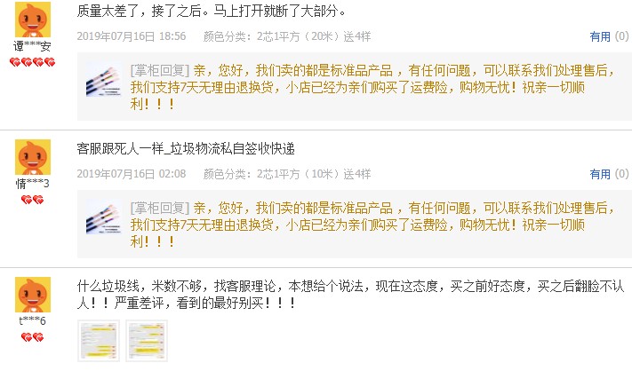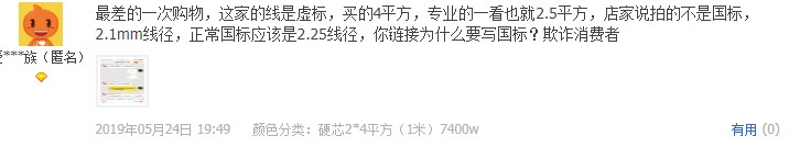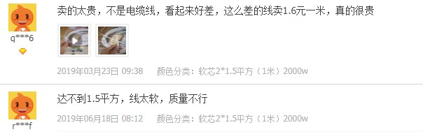 評(píng)價(jià)截圖有很多,我這邊就不一 一發(fā)出來了,總結(jié)幾個(gè)特征,冒充國(guó)標(biāo),截面積虛標(biāo),米數(shù)不足,導(dǎo)體斷線,鋁鍍銅,這個(gè)就是低價(jià)的本質(zhì),如果你是買回家當(dāng)擺設(shè)并且不怕刺鼻味的,盡可能多買點(diǎn),其余用途作為晾衣繩都怕斷。
